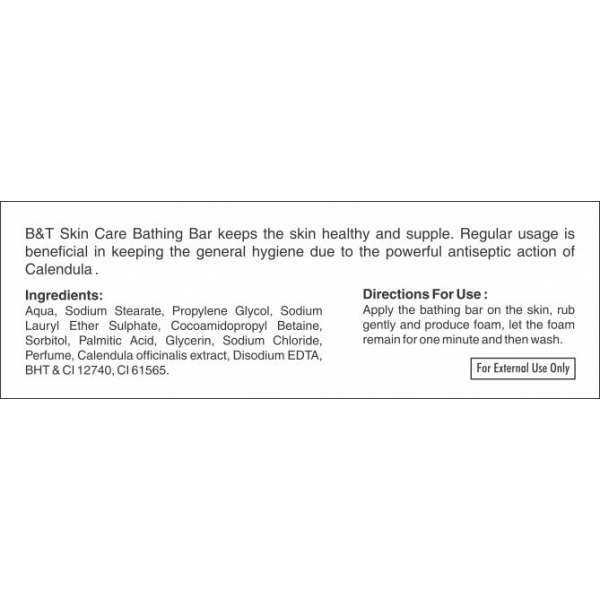 B&T Skin Care Bathing Bar keeps the skin healthy and supple. Regular usage is beneficial in keeping the general hygiene due to the powerful antiseptic action of Calendula.